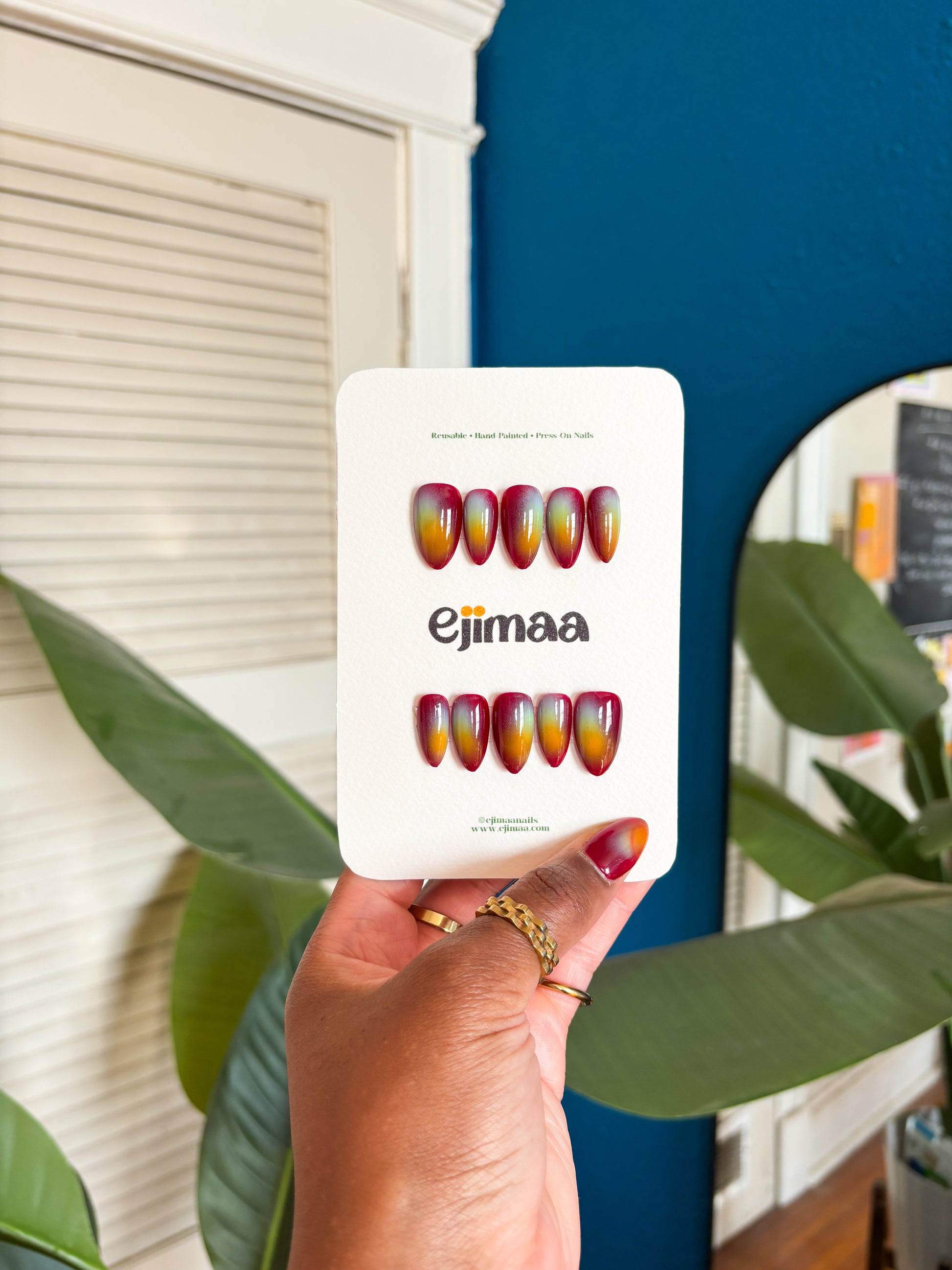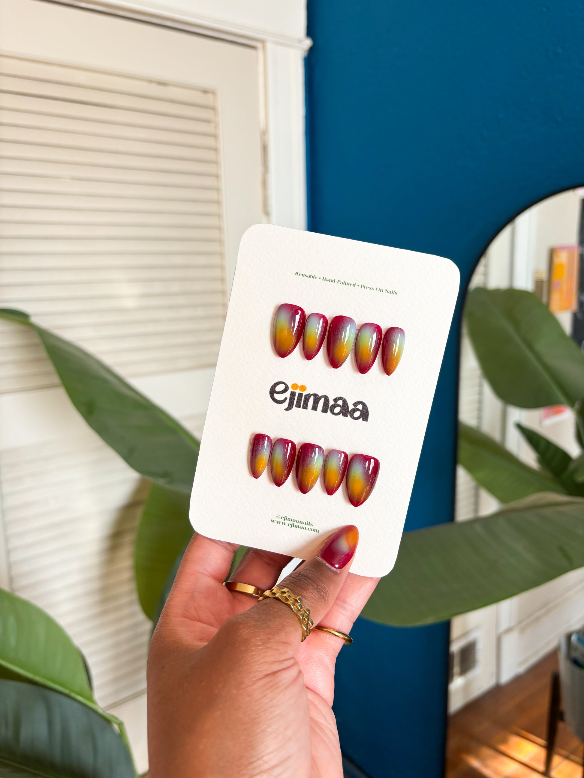 This design features a rich red base with soft, flowing color gradients that blend naturally across each nail.