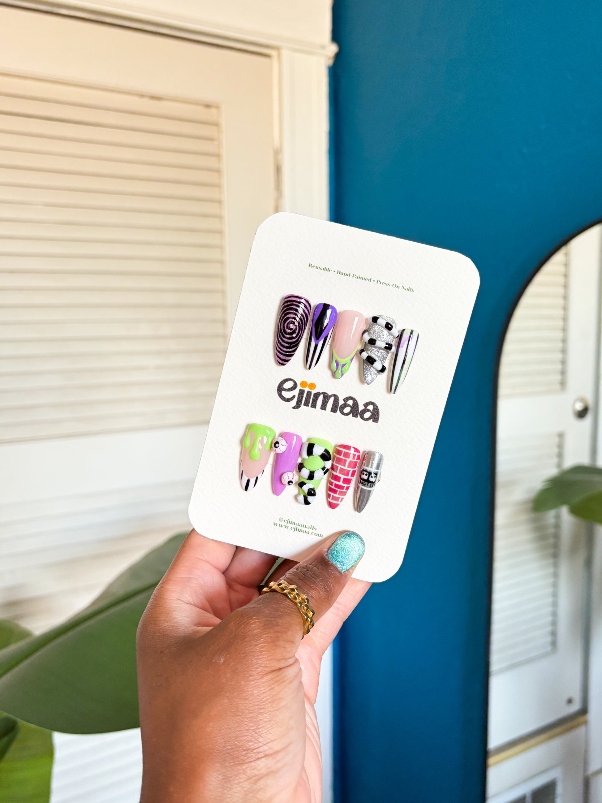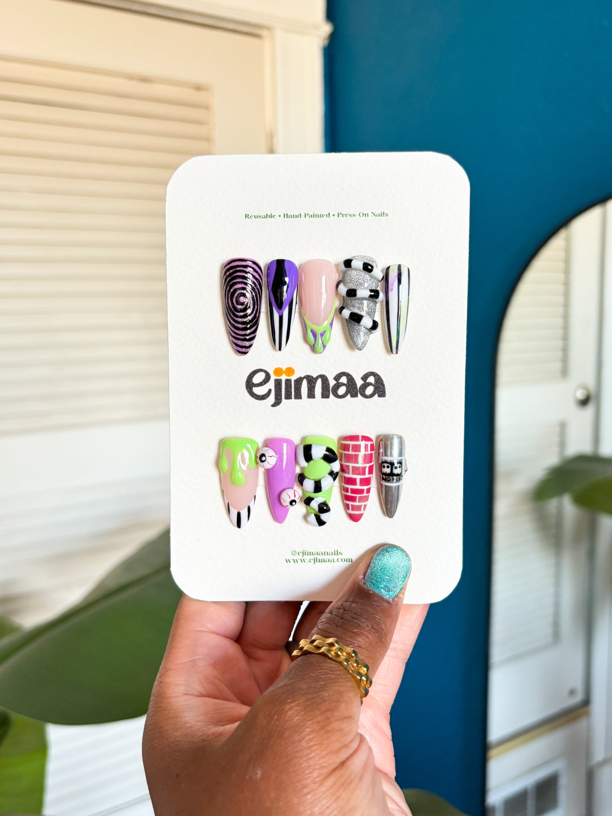 Step into the strange and unusual with this hand-painted, Beetlejuice-inspired press-on nail set. Featuring bold black-and-white stripes, slime drips, hypnotic swirls, brick wall details, and even those eerie eyeballs, this set brings Tim Burton’s cult classic energy straight to your fingertips.