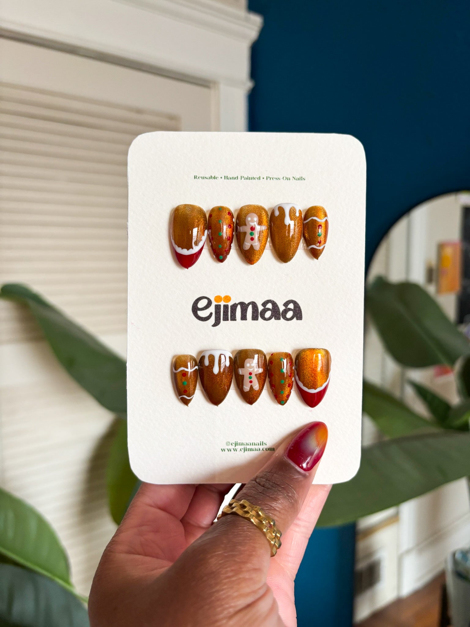 Frosted Gingerbread is the sweetest holiday mix, a little cat eye shimmer, a Santa French moment, a gingerbread man accent, and just enough sparkle to make the whole set feel magical. Festive and so easy to style with your holiday fits.