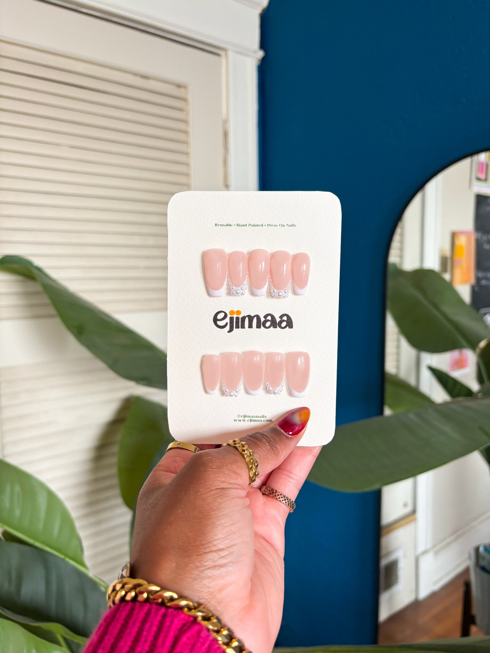 Pearl Babe is a soft, clean, effortless kind of pretty, featuring iridescent accents, crisp white French tips, and a nude base that keeps everything looking fresh and simple.