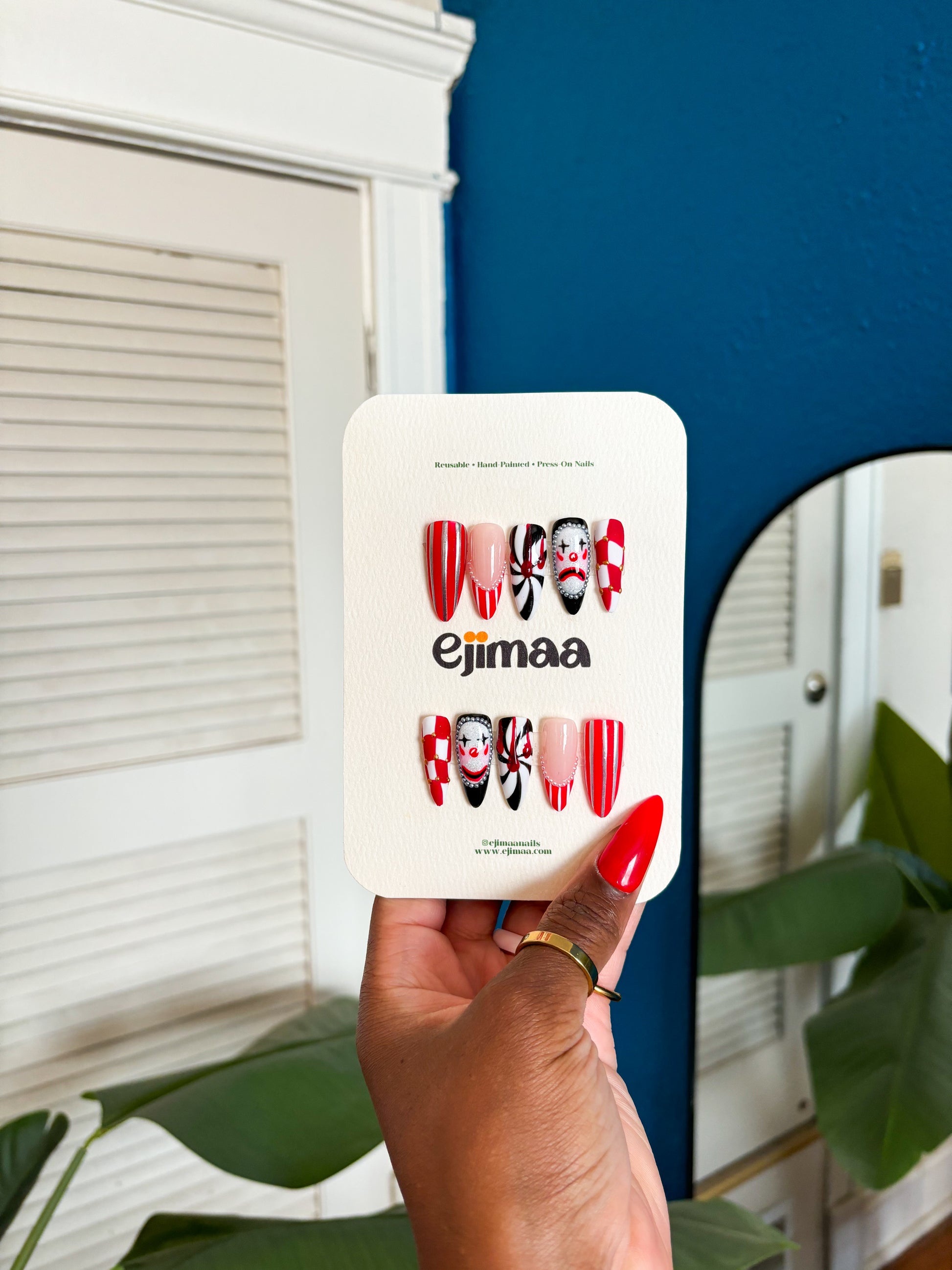 Our Creepy clown set has a Black & white base with red drips, featuring red and silver striped accent nails and creepy clown face details! Super fun and cute for halloween coming up!